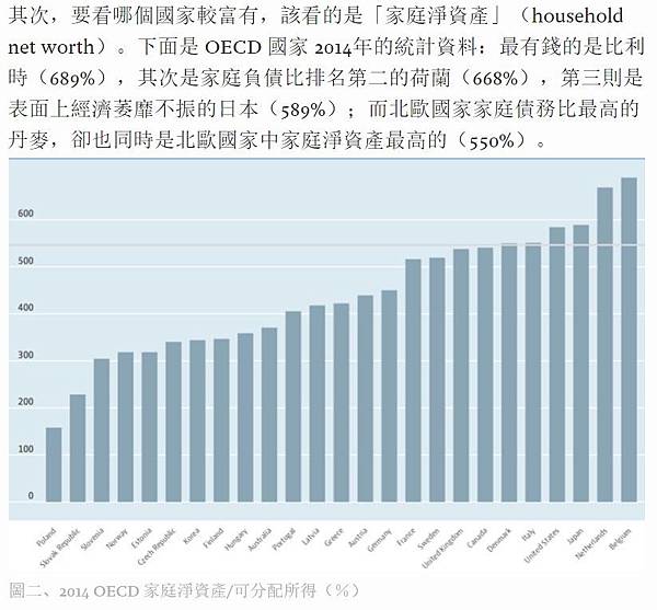 其次,要看哪個國家較富有,該看的是「家庭淨資產」(household net worth)。下面是 OECD 國家 2014年的統計資料:最有錢的是比利時(689%),其次是家庭負債比排名第二的荷蘭(668%),第三則是表面上經濟萎靡不振的日本(589%);而北歐國家家庭債務比最高的丹麥,卻也同時是北歐國家中家庭淨資產最高的(550%)。
