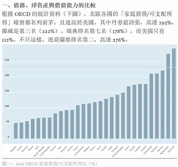 根據 OECD 的統計資料(下圖),北歐各國的「家庭債務/可支配所得」確實都名列前茅,且遠高於美國。其中丹麥最誇張,高達 293%,挪威是第三名(222%),瑞典排名第七名(178%),而美國只有112%。不只這樣,連荷蘭都排名第二,高達 276%。