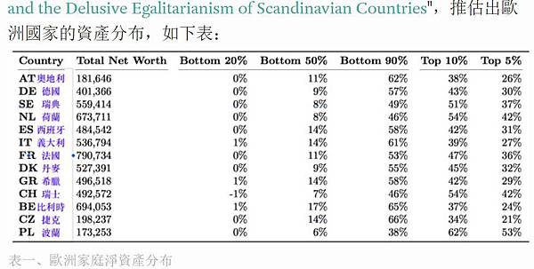 可是,北歐國家的資產分布也頗集中於富人,不是嗎?遠遠不如美國!德國三個學者在 2011年發表一篇論文 "Wealth Inequality in Europe and the Delusive Egalitarianism of Scandinavian Countries",推估出歐洲國家的資產分布,如下表: