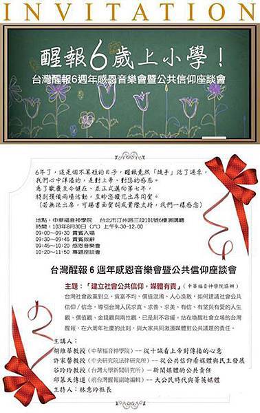 台灣社會政黨對立、貧富不均、價值混淆、人心渙散,如何建議社會公共信仰/信念,導引台灣人民求真、求善、求美、有信、有望與有愛的人生觀、價值觀、金錢觀與兩性觀,已是刻不容緩,站在喚醒社會立場的台灣醒報,願在六周年社慶的此刻,舉辦學術座談會,共同激盪媒體在公共議題上如何善盡責任。