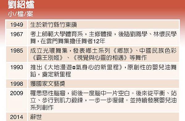 與腦瘤強悍對抗了4年餘,開刀復健後仍數度登台跳舞的光環舞集舞團創辦人、雲門第一代舞者劉紹爐,1日下午因腦瘤發作辭世,享年65歲。