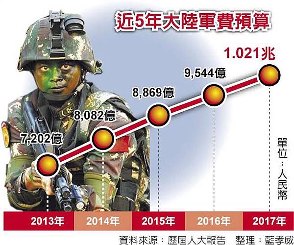 陳舟指出,大陸國防預算自1999年超過1000億元(人民幣,下同)以來,到2016年上升到9543.54億元,今年突破1兆,「這是歷史的必然,有充足的現實依據」;「強軍才能衛國,強國必須強軍」。