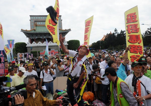 「908台灣國」總會長王獻極與成員賴芳徵朝馬英九丟擲運動鞋和資料袋被起訴,高等法院今仍判兩人無罪,全案定讞。圖為前年10月10日,908台灣國在王獻極(中)帶領下,帶著棺木到立院大門口抗議,隨後抬棺遊行至景福門前「埋鞋葬馬」,並朝總統府丟鞋。(資料照,記者羅沛德攝)