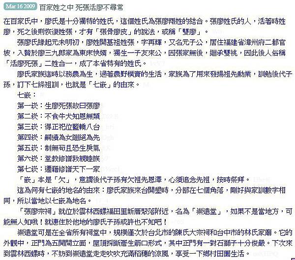 活廖死張- 西螺七崁-為傳承二姓表明「子孫生當廖姓,以光母族,死當姓張,以存父姓」。但其中有一房卻直接複姓為「張廖」,不再生死兩姓+張廖家族是福建省漳州府詔安縣客家人,說詔安客語。 @ 姜朝鳳宗族 :: 痞客邦 :: http://bit.ly/2MNlY7P
