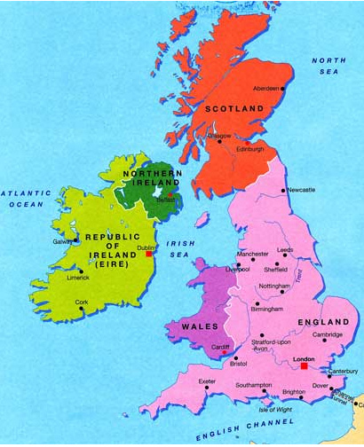 蘇格蘭(橘色色塊)是大不列顛及北愛爾蘭聯合王國的一部分。淺綠色塊的愛爾蘭共和國不在版圖中。翻攝網路