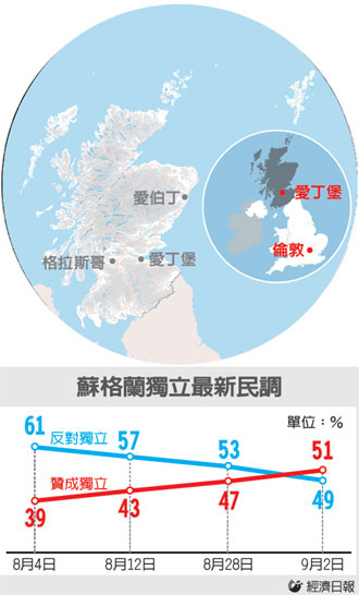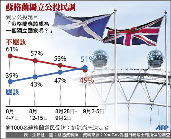 〔編譯張沛元、駐歐洲特派記者胡蕙寧/綜合報導〕七日公布的一份針對蘇格蘭獨立公投投票意向的最新民調結果顯示,支持脫離英國獨立的獨派支持率首度過半,超越續留英國、維持現狀派的支持率。蘇格蘭即將在十八日舉行獨立公投,這份民調數據顯示,蘇格蘭人可能在公投中做出脫離英國獨立的決定。而為避免蘇格蘭出走,英國政府承諾只要蘇格蘭願意續留英國,將賦予當地更大自治權限。