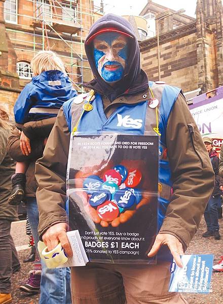 蘇格蘭首府愛丁堡街頭1名男子,在臉部塗上象徵蘇格蘭戰士的油彩,身上掛一個支持「蘇獨」的海報,呼籲路人一定要對公投投下贊成票。(美聯社)