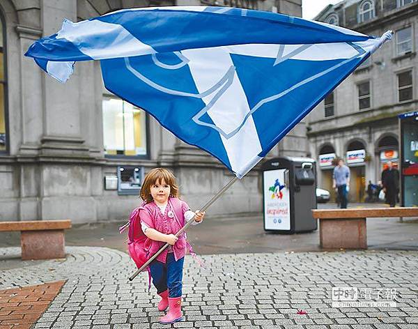 蘇獨公投18日舉行,1名孩童在亞伯丁街頭揮舞寫著「Yes」大旗,鼓勵民眾投贊成票。(法新社)