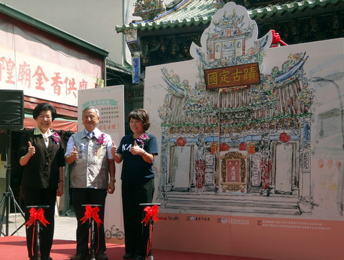 嘉義市「古蹟日」13日在城隍廟舉行開幕典禮,監察院長張博雅、嘉義市長黃敏惠為城隍廟爭取升格為國定古蹟加油打氣。