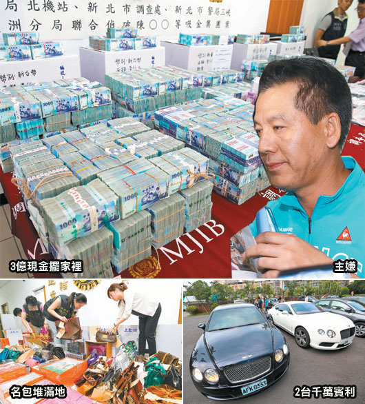 檢調昨偵破假投資真詐騙案,在主嫌家中搜出逾三億元現金,並查扣2輛他送女友的賓利車, 及上百個堆積如山名牌包。