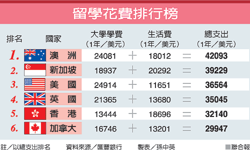 匯豐集團最新調查顯示,近7成台灣父母希望子女出國接受大學教育,美國仍是台灣學子出國留學首選。美國大學1年學費平均2萬4914美元(約台幣75萬元),若加計生活費用,在澳洲留學1年要花掉4萬2093美元(約台幣126萬元),總花費最高。