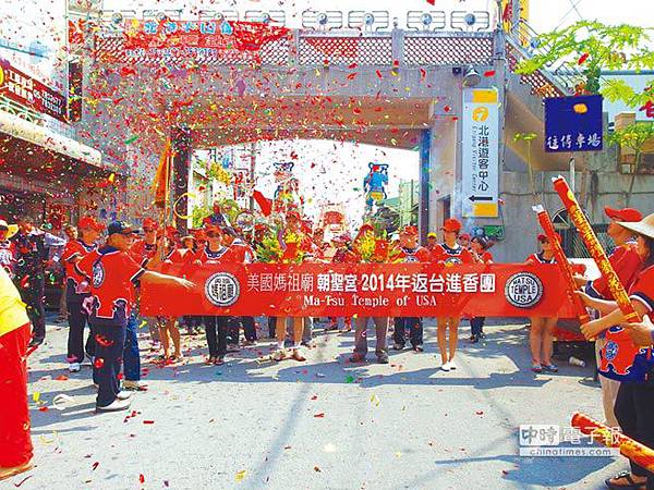 雲林縣北港朝天宮分靈「美國媽祖廟朝聖宮」進香團,10日飄洋過海前往朝天宮謁祖,近百名國內外信眾依古禮,穿著傳統轎班衣服隨轎參拜,場面盛大。朝聖宮因香火鼎盛,已被舊金山市政府列為觀光景點之一。