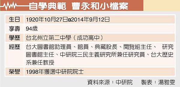 〔記者林曉雲、湯佳玲/綜合報導〕只有中學畢業,全靠自學和苦學,開啟台灣史研究先河的中研院院士曹永和,昨天因多重器官衰竭辭世,享壽九十四歲。