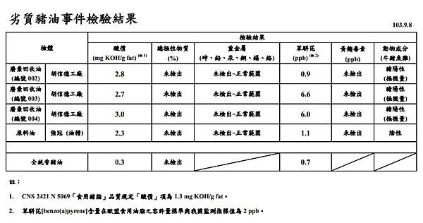 根據食藥署昨日公布「全統香豬油」檢驗結果,酸價0.3mg KOH/g fat,遠低於CNS 2421 N 5069「食用豬脂」規定的酸價必須低於1.3mg KOH/g fat,總極性物質也未檢出,苯駢芘0.7ppb也低於食藥署監測指標值2ppb。