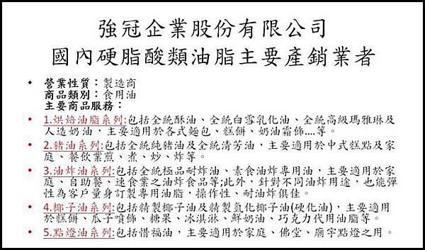 食藥署副署長姜郁美則表示,目前僅是針對檢警單位送來的樣本進行檢驗,目前強冠企業的產品端除了檢驗「全統香豬油」,並要求以該產品為原料的終端食品下架,未來不排除擴大抽查強冠企業其他的食用油品。