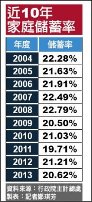 根據主計總處資料,2013年平均每戶可支配所得94.2萬元,較2012年增加2.02%,平均每戶消費支出74.8萬元,增加2.78%;由於消費支出增幅大於可支配所得,2013年平均每戶儲蓄金額僅19萬4286元,較2012年減少1605元;平均家庭儲蓄率20.62%,較2012年降低0.59個百分點。