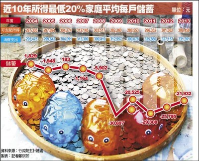 舉例來說,當出現「負儲蓄」現象時,家戶就得拿出過往儲蓄、或是舉債,來支應生活所需。依主計總處統計,馬政府執政七年來(二○○八到二○一四年),所得最低廿%家庭平均每戶累積「負儲蓄」已達十五.三四萬元。(記者高嘉和)
