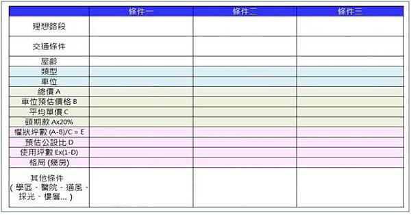 就我初步的「猜測」(猜測就好),那邊18年內的中古大樓每坪單價約40萬,而坡道平面的車位約200萬,同樣的邏輯換算下來,我需要準備的頭期款是360萬(1800萬x20%),總價1800萬扣掉200萬的車位後,再除以每坪40萬的單價,我可以買的起的權狀坪數是 40 坪,扣掉20%的公設,我可以使用的坪數是32坪,只要格局方正,一樣夠做三房兩廳的格局。因為我知道那一帶靠近菜市場,所以我在「其他條件」那邊特別列了「不要在菜市場裡面」。如此一來,我的第二組條件也出來了!