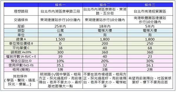 由於找房子時,相似的預算,可能有不同的選擇。例如,如果我的總價預算可以往上拉到 1800萬,我希望除了無電梯公寓之外,我也可以考慮有車位的電梯大樓,最好屋齡在18年內,這樣公設還不會太高,大約20%左右。可是我知道,如果我堅持路段要跟上一組條件一樣,都在內湖區康寧路三段的話,那邊的中古電梯大樓單價可能會太高,我用1800萬的預算可能買到的坪數會太小。因此,我選擇同樣屬於東湖捷運站周圍,但路段比較裡面一點的康樂街、東湖路、五分街。