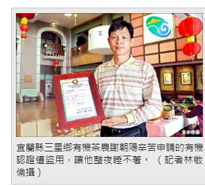 宜蘭縣三星鄉有機茶農謝朝陽辛苦申請的有機認證遭盜用,讓他整夜睡不著。
