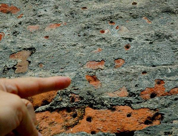 文化部文資局今天現勘恆春古城門,屬該填補的真正裂縫,與彈孔有些許相似也導致誤判。(記者陳彥廷攝)