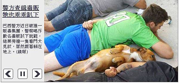 〔即時新聞/綜合報導〕巴西警方近日破獲一販毒集團,當時警方進行突襲時,喝斥數名毒販趴下就範,結果旁邊一隻毒販養的看門犬見狀,居然跟著躺在地上,一副投降的樣子,模樣非常可愛。