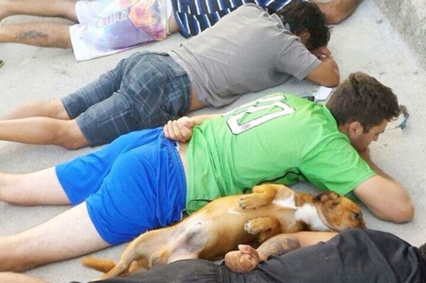 狗狗看到主人們被逮,也躺下來投降。(圖取自《鏡報》)