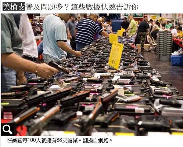 每百人就有88支槍。根據統計,在美國每100人就擁有88支槍械。而排名第二的葉門,每百人僅有54.8支槍械,與美國差距極大。