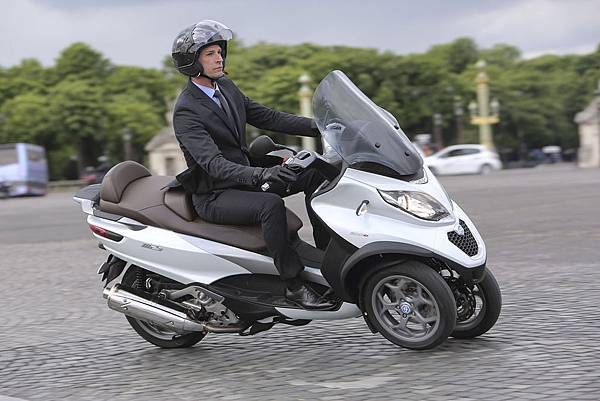 法國前總統歐蘭德(Francois Hollande)由助理騎著台灣易維特科技公司所生產的EVT-4000e電動機車。(翻攝自網路)