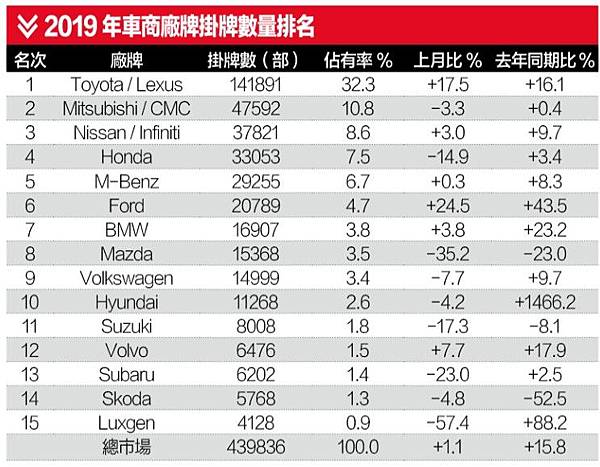 根據最新公佈統計數據顯示,2019年國內新車市場共掛牌新車達到439836輛,約比2018年成長1.1%,進口車達到209949輛,佔比為47.7%,國產車全年佔比52.3%,而其中有包括8月、10月、11月三個月進口車佔比高於國產車,全年高級車累積掛牌數量為89113輛,佔總市場比例達到20.3%,正式站上全市場1/5比例,2019年不但是國產車風雨飄搖的一年,同時也是高級車對一般品牌步步進逼的一年,可以說2019不僅在驚濤駭浪中度過