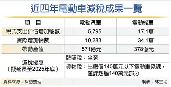 另我國貨物稅條例第12-3條規定,電動車出廠價格在140萬元以下免徵貨物稅,僅課徵超過140萬元以上部分,同樣為2021年底到期。李慶華指出,經濟部已提出稅式支出評估,財政部也大致完成審核,原則上財經兩部皆有共識再延長四年。