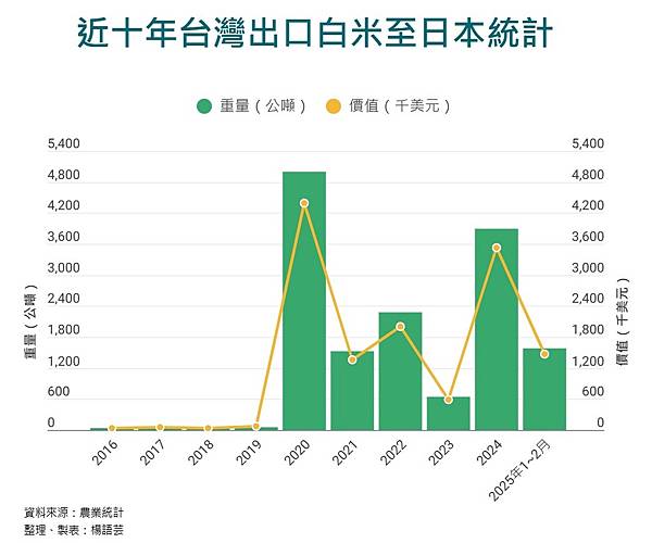 根據日媒共同社、NHK報導,根據農業部農糧署統計,今年1至5月稻米輸日量達7759公噸,為去年同期的6倍以上,比2024年整年高出約2倍,預估今年全年將超過1萬公噸。