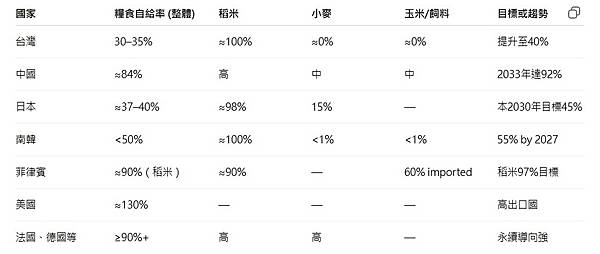 臺灣目前糧食自給率僅約 30–35%,高依賴國際市場與氣候影響。相比中、日、韓的目標與現況,確實落後。政府訂定提升至 40% 的中期目標,但需配套全面升級農業政策,並積極深化國際合作與氣候韌性,以增強糧食安全。
