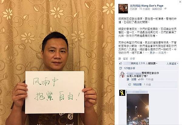 香港和平佔中運動邁入第7天,連日來衝突不斷,今晚特首梁振英下達最後通牒,表示下周一要恢復交通,王丹在臉書上發文表示,「香港的命運,已經到了最後的關頭」,他並拍照舉牌,牌子上寫著「風雨中抱緊自由!」