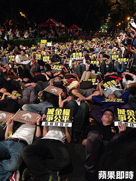 20點45分,萬人怒躺仁愛路,以骨牌方式,逐一陸續躺在1坪600萬元的地上。