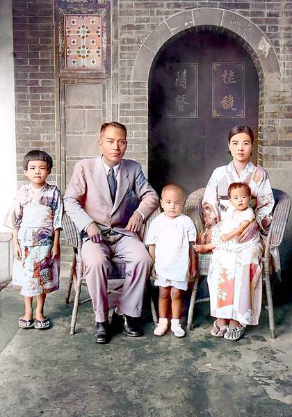 老姜家族姜振乾派下,姜振乾的長子姜重山與妻子彭平妹及子女於天水堂新屋內合影(攝於1937年)。天水堂新屋位於金廣福公館後方,建造於1907年,鑑於當時天水堂老屋因家族人口眾多已不敷使用,故由姜振乾與姜紹猷共同出資另建天水堂新屋(姜家人稱「新屋」,外界稱為天水堂二房)。