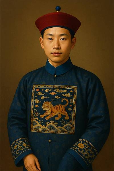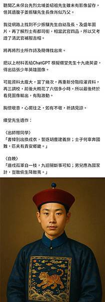 我從網路上找到不少振驤先生自幼及長、及盛年圖片,再了解烈士有都司銜,相當武官四品,所以又考證了清武官補服吉帽。