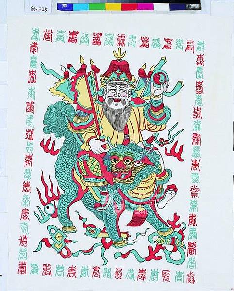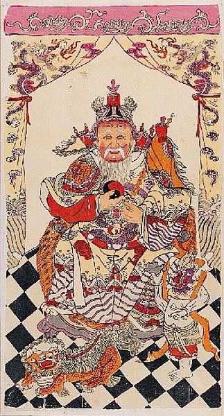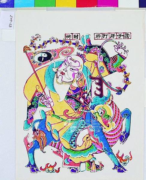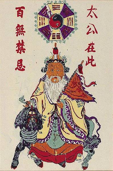原圖所繪人物為姜太公。姜尚名望,字子牙,輔佐周武王滅商有功,封於齊,有太公之稱,俗稱姜太公。在民間傳說中他是一位斬將封神,驅魔役鬼,法力無邊的神仙,在新歲張貼姜太公年畫。認為可以消除災難,迎來喜慶吉祥。