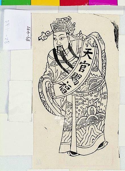 東漢張陵創立道教,其子張衡在其死後繼續傳道,大力提倡「三官」信仰。三官即天官、地官、水官,且天官主賜福、地官主赦罪、水官主解厄,其中尤以天官最為人歡迎,而成為年俗版畫中重要的母題來源之一。天官又被稱為福神、福星,典型形象是朝官裝束、紅色袍服、手持如意、慈眉善目、五綹長髯,一派喜顏悅色華貴氣象。此幅版畫為單色,天官持書寫「天官賜福」的條幅,喜慶的氣氛十分明顯。