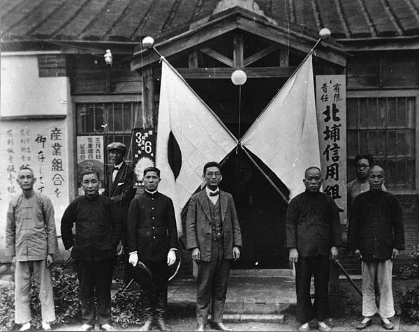 描述:北埔的經濟型態,自墾隘以來,貧富懸殊,日本時代,有鑑於富者無金融機構存放餘款,貧者被民間高利所困無處可支借,日本政府為使地方經濟更為活絡,於是在各地推展金融機構之設立。大正五年「北埔貯金(預金)會」成立,由老姜的姜振乾發起擔任組合長,專務是郭泉興,發起人包含大隘地區有力人士,新姜姜滿堂、老姜姜振驤、姜振義、公醫羅享標等,會員有一百人。大正八年改為「北埔信用組合」,所轄為北埔峨眉寶山。到了昭和三年、八年,峨眉寶山才各自設立信用組合。本圖左二鄧瑞坤、左三羅享標、左四姜瑞昌,左五郭憨。後排左郭宗賢,右彭清欽。據姜瑞昌之孫姜良旭指出,姜瑞昌此時擔任組合長。年代:日大正8年至日昭和5年(西元1919至1930年)