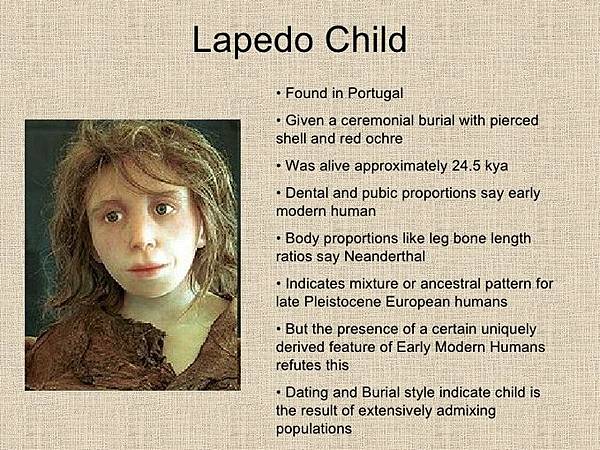 然而,「拉佩多孩童」的發現卻打破了這個論點。這名孩童的骨骼化石展現出現代人類和尼安德塔人的混合特徵:他擁有現代人的下顎骨和內耳結構,卻又長著尼安德塔人典型的粗壯身體和四肢。