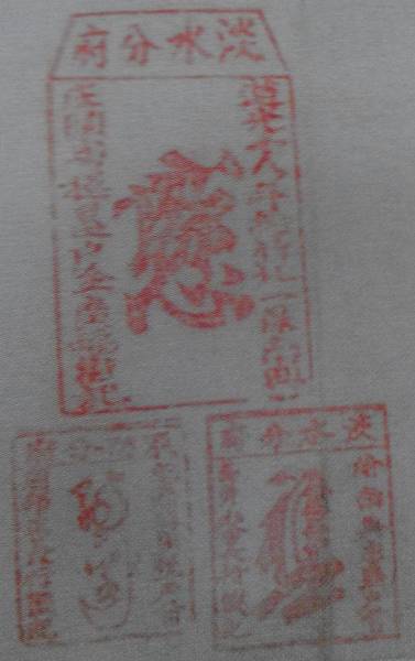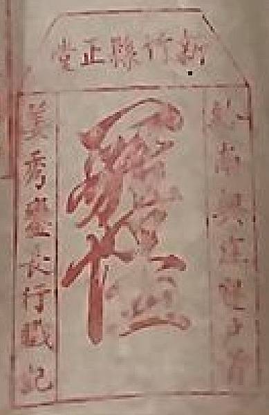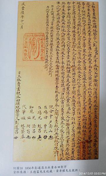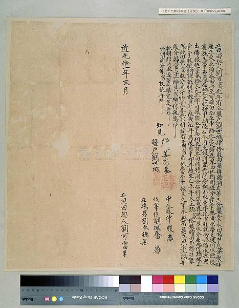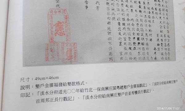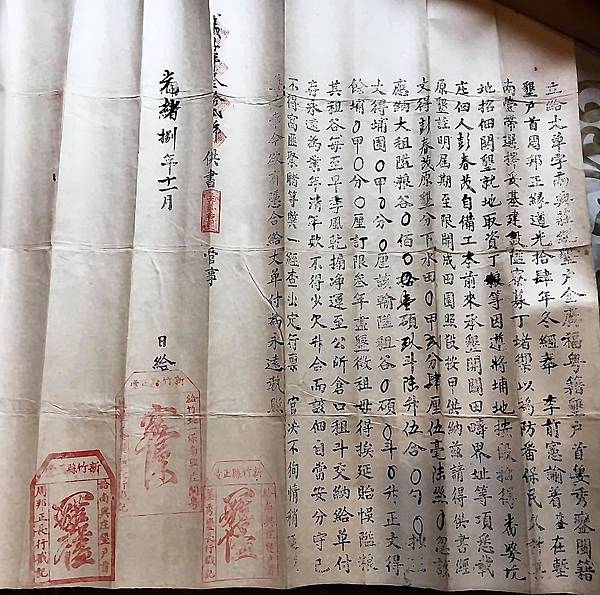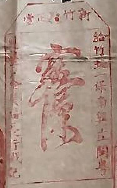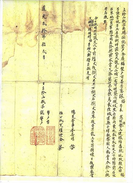 描述:這是受訪者父親陳龍發先生留下的一份清道光二十年的文件,它是存放在一個相框裡面,放在書櫥的上面,因家裡樓上曾經漏水,因此部分地方被水滲透弄髒了,幸好未損壞,字跡仍非常清晰可見。 一份清道光二十年、由當時金廣福墾戶首姜秀鑾所批示的同意書,最後面有蓋墾戶首姜誏、總墾戶金廣福的戳章。 全文是用毛筆繕寫,內容抄錄如下: 「立給山批字南興莊總墾戶金廣福墾戶首姜秀鑾緣 福等奉 憲在南勢山建隘防番就地取粮今因 福等 管地方土名赤柯坪莊背大龍尾山埔一處可堪築穴做坟坐西南向東北或左或右及上下均踏前后左右界址四至帶踏分明出給與羅家賞兄簽 伊弟金骸萬載佳城並無干碍抵塞別人物業合給山批付為執照」 「即日批明經同議定穴中前陸丈後捌丈為界左捌丈右捌丈為界後至龍上不淂損壞日後羅家賞兄界外概不得阻碍 福等佃人耕種立批是實」 最後寫著:「場見管事姜長妹 公正,依口代芼徐世全 畫押 」 道光弍拾年拾貳月 日立給山批字墾戶首(戳記-墾戶首姜誏)總墾戶(戳記-總墾戶金廣福) 別名:契書-數位典藏與學習聯合目錄(6158069) http://tinyurl.com/yyyuv5dk