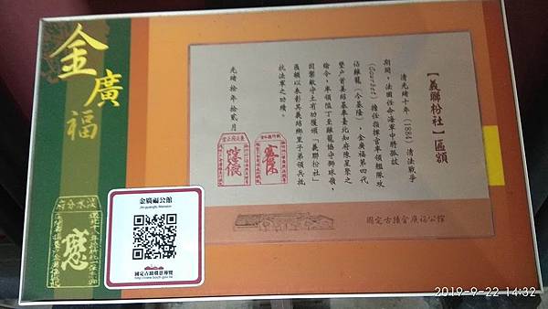 為保護珍貴的文化資產,現懸掛於金廣福公館大廳前之金廣福匾額為複製品,原件由北埔姜家後代另行收藏。