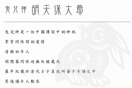 關於「兔兒神」,最早出現在清代袁枚的文言小說《子不語》,當中描述到:清朝初年,有位年輕的御史被派到福建去巡視。當地有位叫做胡天保的人,被年輕御史的美貌顏值所吸引,每次御史升堂時都一直偷瞄御史的帥樣。被看得心裡有些疑惑的御史卻始終不明白。過了不久,御史到其他地方巡視,胡天保也跟著去了,甚至還埋伏在廁所裡偷看御史方便(好孩子請不要學)。畢竟在那時,要勇於承認對於同性之間的愛意,並不是件容易的事情,所以只能用這種偷偷摸摸的方式。