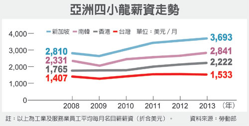 2013年台灣人平均每月薪資為1,533.9美元,2008年金融海嘯至去年成長9%,但薪資成長速度遠遠趕不上南韓22%、新加坡31.4%,以及香港25.9%,因而擴大差距。