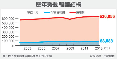 台灣人的工時長名列前茅,換算成每小時勞動報酬,2012年台灣製造業勞工每小時勞動報酬為9.46美元,不如南韓的20.72美元、新加坡24.16美元。勞動部官員說,正因為低薪,勞工得經常超時工作,換取一家溫飽。