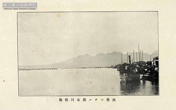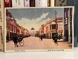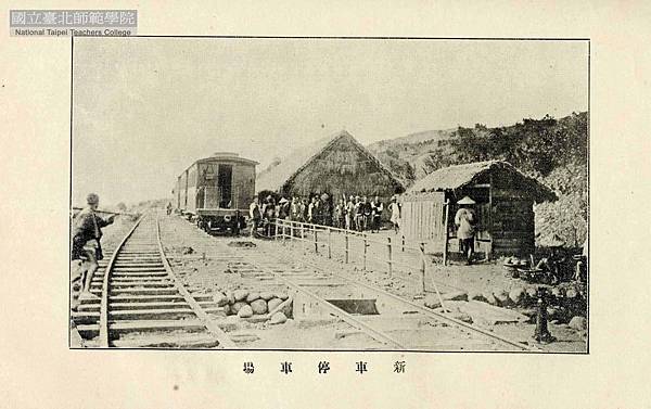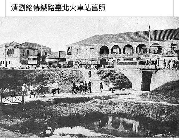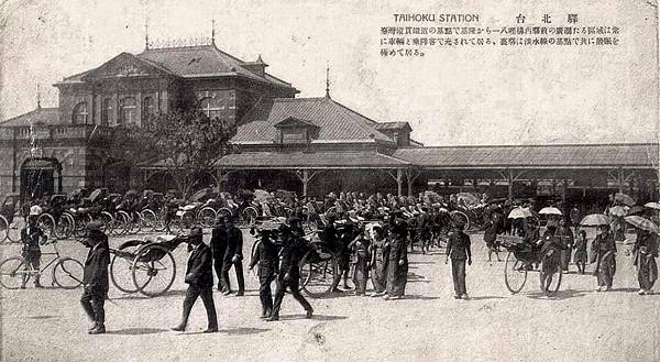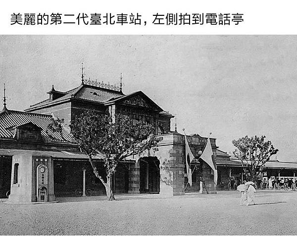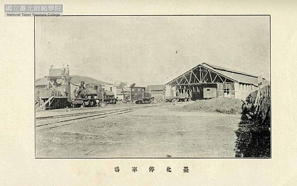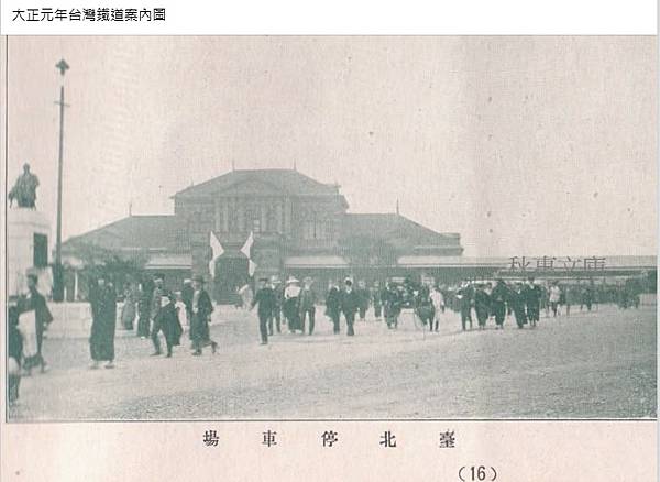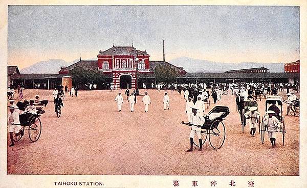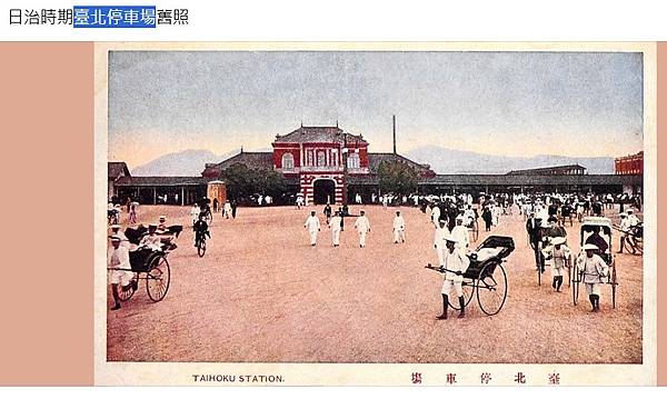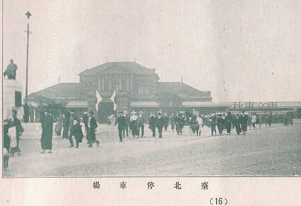圖中的車站為日本時代1901年啟用之臺北車站,位於今臺北車站旁正對館前路的位置(大約在今車站旁停車場區域),為臺北的第二代車站。