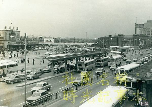 .描述:民國60年代,台北火車站前,有公共汽車與稍可避雨防曬的候車亭