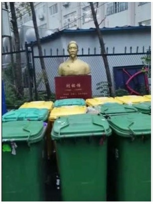 中國安徽合肥蜀山區的一個小區內,竟然將舍區垃圾桶都堆積在劉銘傳雕像前面,讓這為清末愛國將領每天在這裡看垃圾桶。