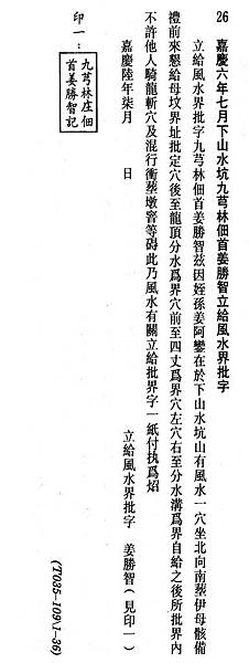 立給風水界批字九芎林佃首姜勝智茲因胞姪姜阿雙在於坪林藔坑墘有風水一穴坐東向西